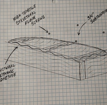 Strength and precision. Every floor panel is glued and secured with evenly spaced structural screws for a clean and intentional look. We take the time to ensure that the sub-floor is a perfectly flat, unified and silent foundation for your workshop or storage needs.