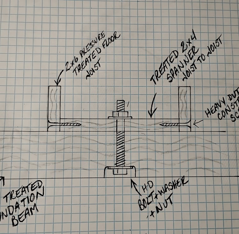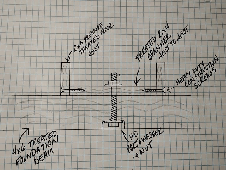 Our through-bolt system locks the floor joists to the 4x6 foundation beam ensuring a strong connection and a shift free foundation.